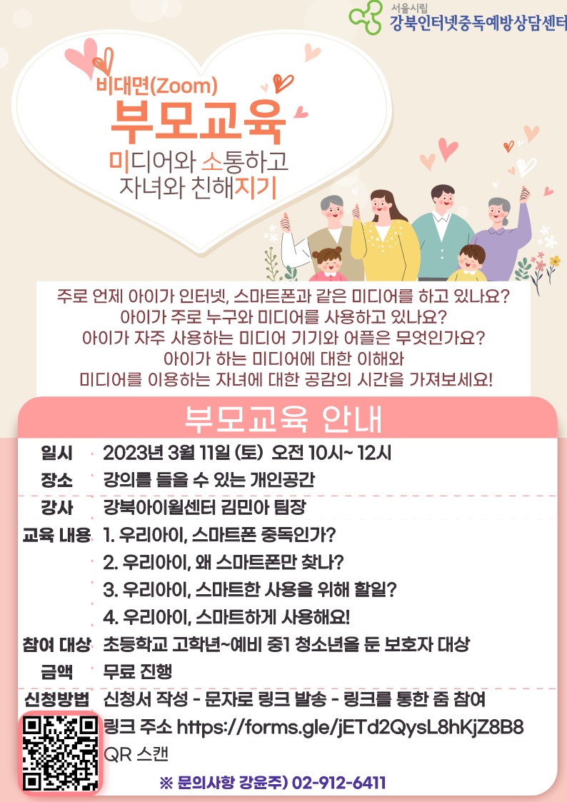 공지사항 3월 부모교육 참가자 모집 페이지 정보 작성자 : 관리자 작성일 : 23-03-09 본문 안녕하세요.강북인터넷중독예방상담센터입니다. 23년 첫번째 부모교육에 여러분을 초대합니다.자녀가 사용하는 미디어에 대한 이해와미디어를 이용하는 자녀에 대한 공감의 시간을 가져보세요!일시: 2023년 3월 11일 (토) 오전 10시~ 12시장소: 강의를 들을 수 있는 개인공간강사: 강북아이윌센터 김민아 팀장대상: 초등학교 고학년~예비 중1 청소년을 둔 보호자 대상금액: 무료 진행신청: 신청서 작성 - 문자로 링크 발송 - 링크를 통한 줌 참여링크 주소 https://forms.gle/Bjn5UAEKMevzGiAq7문의사항 02-912-6411 목록 관련링크 https://forms.gle/Bjn5UAEKMevzGiAq7 737회 연결 http://iwill.or.kr/data/editor/2303/d1fe082ae0184069ccb63c3e9620b626_1… 622회 연결 이전글대안활동 미로야놀자 4월 참가자 모집 23.03.27 다음글11월 부모교육 참가자 모집 22.11.01